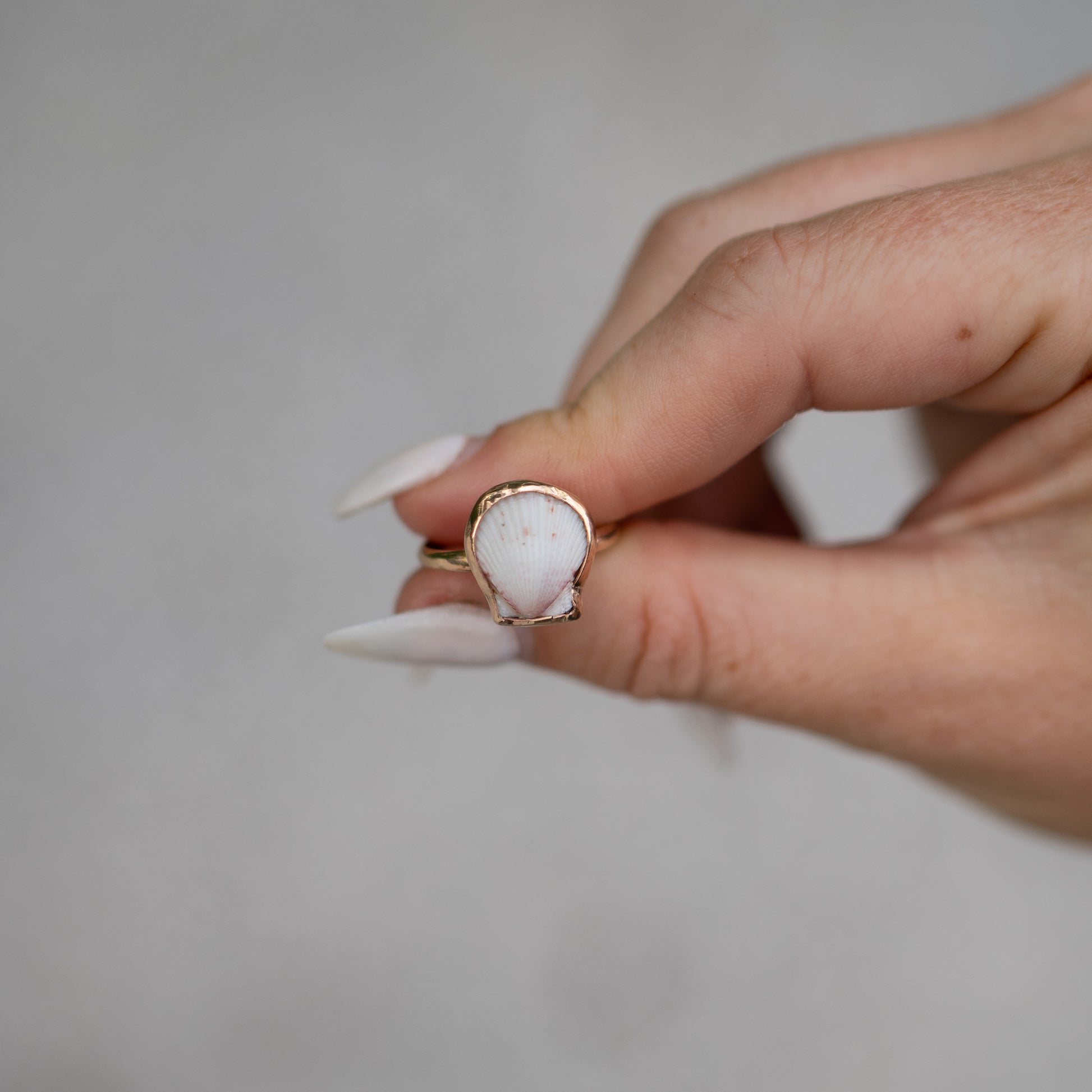 A little treasure from the sea, kissed by the sun and set in gold. This handmade ring features a naturally beautiful Calico Scallop shell collected from the tranquil shores of Southwest Florida. A keepsake that holds the memory of soft tides, sandy feet, and slow coastal mornings.