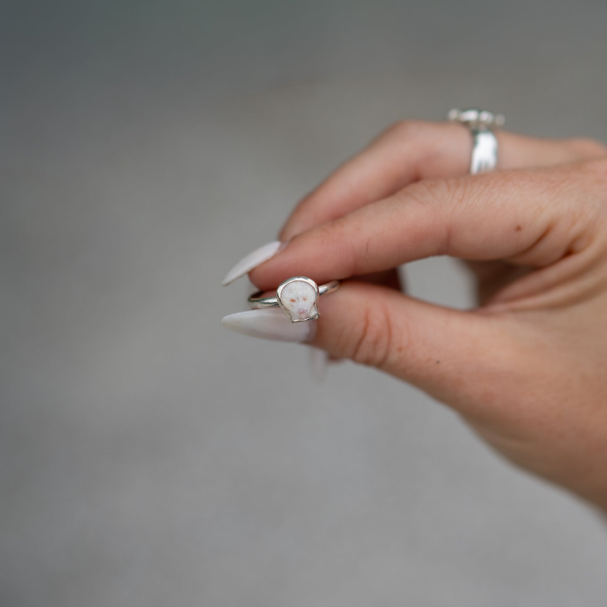 Adorn yourself with a piece of the beach with this handcrafted stacking ring set. One ring features a natural Calico Scallop shell collected from the beaches of Southwest Florida, set in sterling and fine silver that can be stacked with two sterling silver bands with a hammered texture.